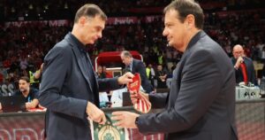 Ξέρω ακριβώς που είναι ο Βαλαντσιούνας, δεν είναι στην Αθήνα ακόμα πάντως. Ρωτήστε αυτόν για όσα έγιναν χθες (σ.σ. εννοεί τη γνωστοποίηση της συμφωνίας με τον Παναθηναϊκό). Συνεχώς λέω στους ανθρώπους: γιατί θέλετε τη γνώμη μου για τους παίκτες εντός παρκέ; Μπορώ να σας πω για τον Γιόνας εκτός παρκέ, είναι πραγματικά ξεχωριστός άνθρωπος. Ήταν και μαζί μου στο Άμπου Ντάμπι, είπε αρχικά και συμπλήρωσε με ατάκα στα ελληνικά πως σε δύο ωρίτσες ο Βαλαντσιούνας θα είναι στην Αθήνα.