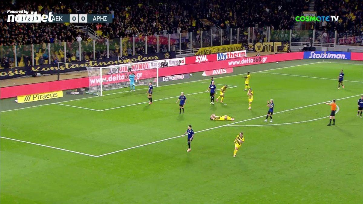 ΑΕΚ – Άρης: Ο Φιλίπε Ρέλβας έπιασε εντυπωσιακό σουτ στην κίνηση εκτός μεγάλης περιοχής αλλά η μπάλα δεν του έκανε το χατήρι και σταμάτησε στο οριζόντιο δοκάρι. Στην επαναφορά ο Λούκα Γιόβιτς επιχείρησε να σκοράρει με ανάποδο ψαλίδι, όμως δεν βρήκε στόχο.