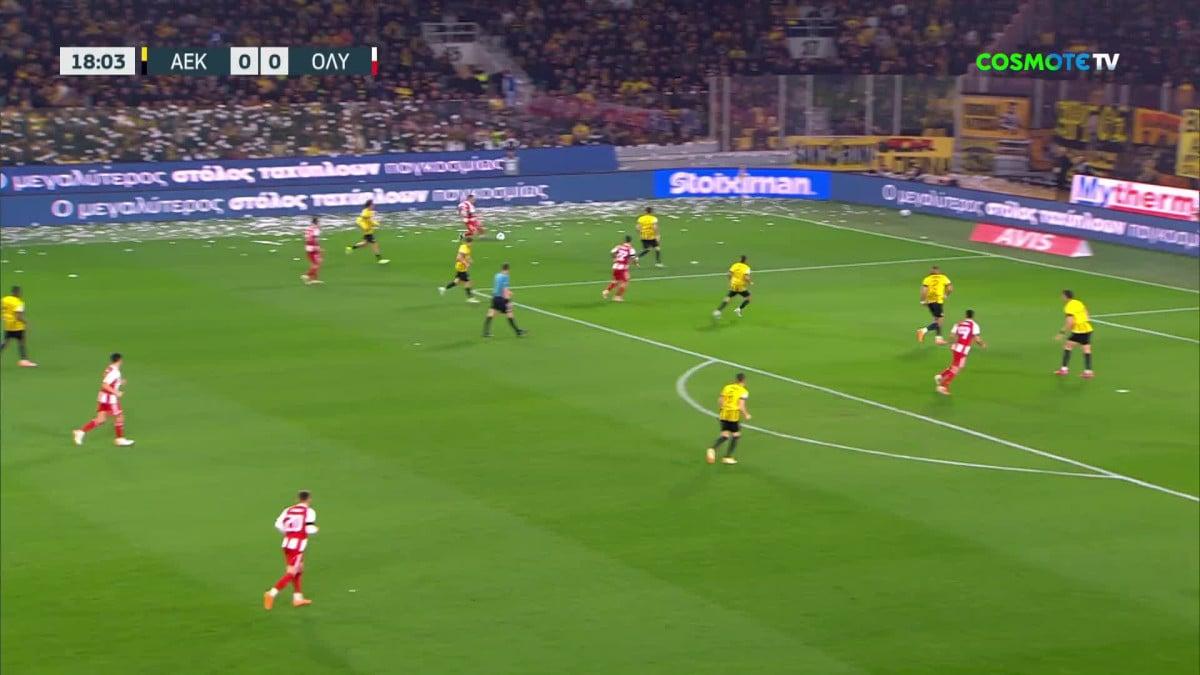 Ολυμπιακός: Τεράστια ευκαιρία για τους Ερυθρόλευκους κόντρα στην ΑΕΚ όταν στο 19 μετά από παράλληλη πάσα του Ορτέγκα, ο Ροντινέι στο δεύτερο δοκάρι θα κάνει το σουτ, με τον Στρακόσια να αποκρούει πάνω στη γραμμή.